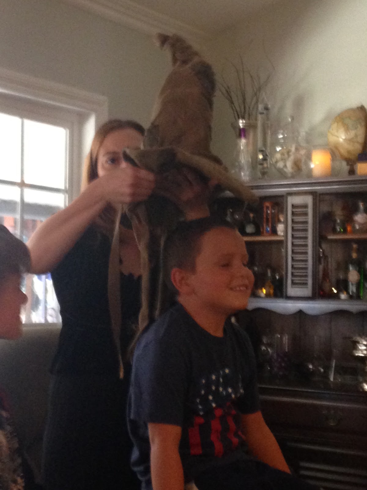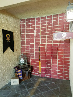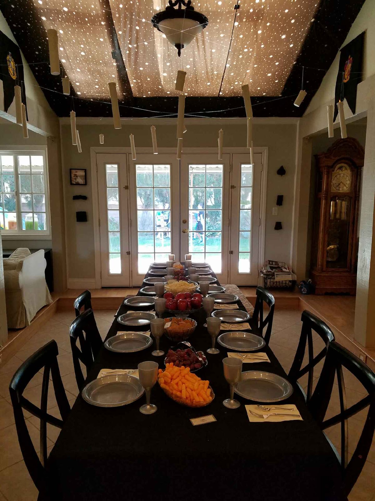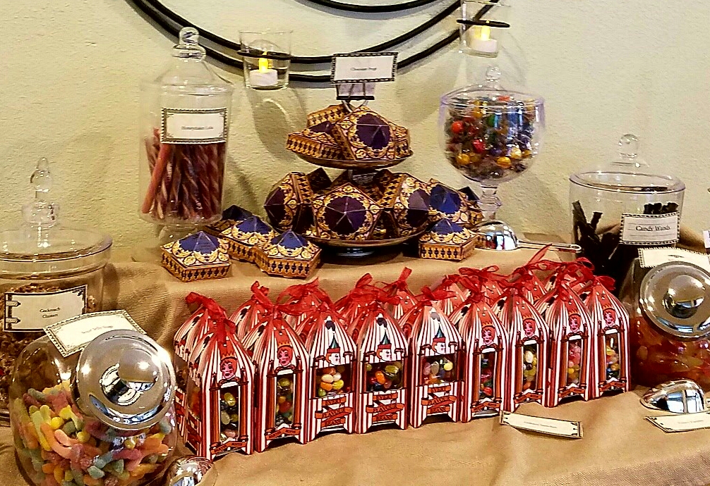 Our living room was set up with portraits of famous wizards, a potions cabinet with a pensive and some other items you may find in the wizarding world. We used battery powered faux candles everywhere since we had 23 nine year old boys.
