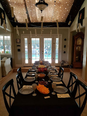 I had the hardest time decorating in the kitchen and Den. We made a Café 80's sign and we created the Hover Board which hung from the chandelier in the kitchen. Creating the Hover Board took many nights but the end result was pretty cool. Since Lunch was served in the Kitchen the plates and cups were labeled with the Café 80's logo. We used waterproof labels on a laser printer to create the effect. We also had futuristic glasses for our guests to get their 2015 on.
